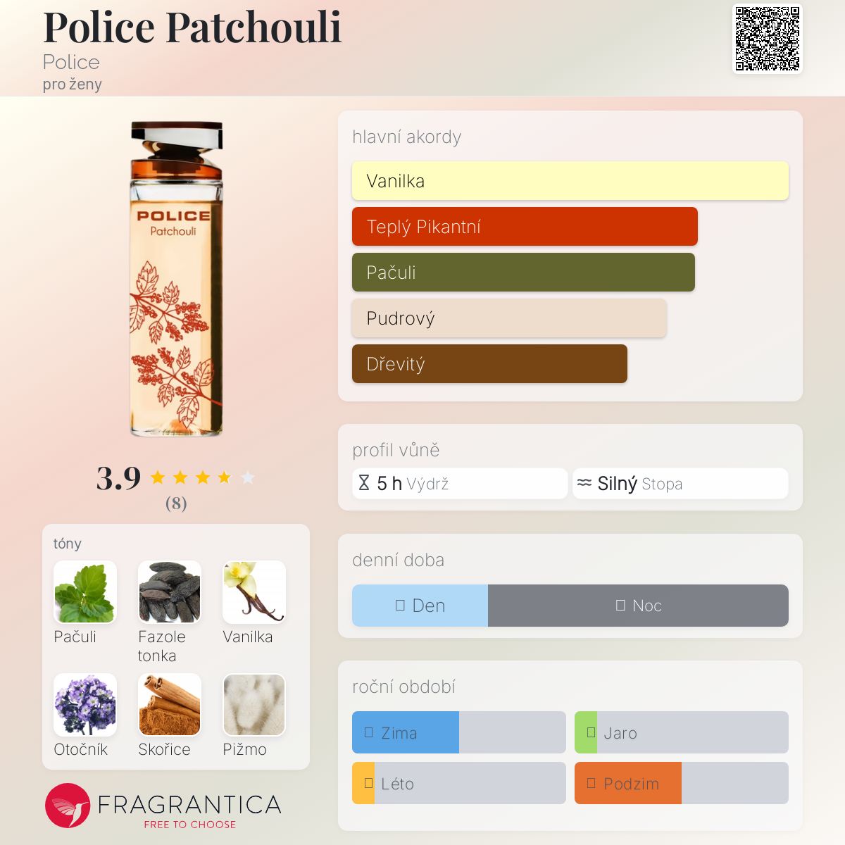 Police Patchouli podle Police je Chypre vůně pro ženy. Police Patchouli byl/a uveden/a v roce 2016. Vrchní tóny jsou Skořice a Citrón; střední tóny jsouPačuli a Otočník ; základní tóny jsou Fazole tonka, Vanilka a Pižmo.