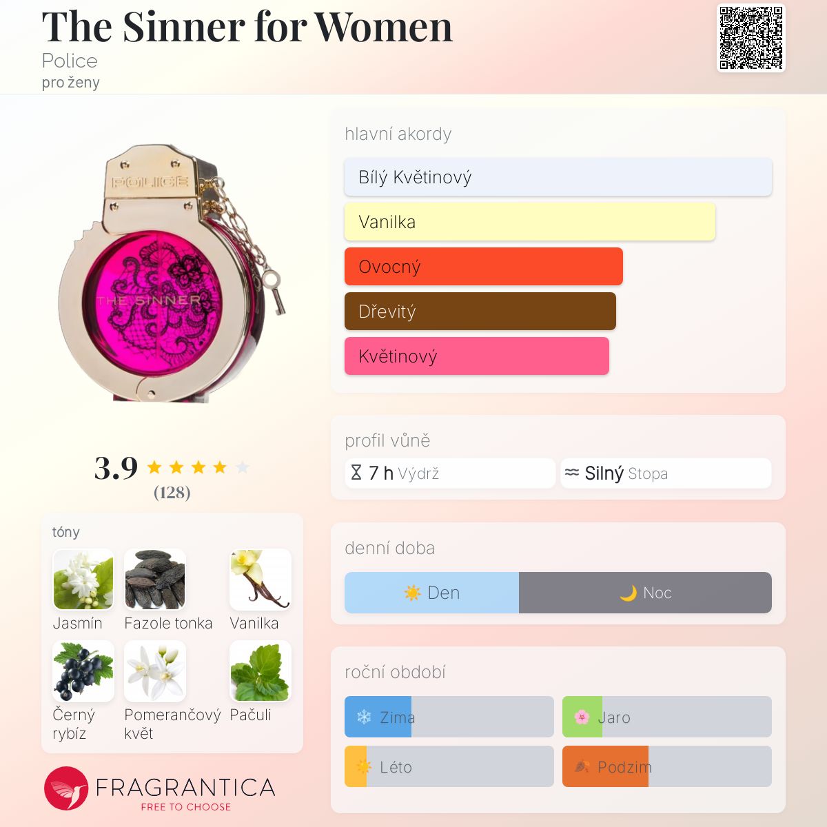 The Sinner for Women podle Police je Orientální Floral vůně pro ženy. The Sinner for Women byl/a uveden/a v roce 2014. Vrchní tóny jsou Černý rybíz a Jablko; střední tóny jsouJasmín, Pomerančový květ a Brambořík ; základní tóny jsou Fazole tonka, Vanilka, Pačuli, Otočník a Cedr.