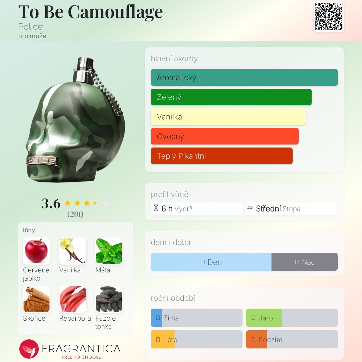 To Be Camouflage podle Police je Orientální Fougere vůně pro muže. To Be Camouflage byl/a uveden/a v roce 2015. Vrchní tóny jsou Červené jablko, Máta, Kardamom a Citrón; střední tóny jsouSkořice, Rebarbora, Levandule, Ozonové tóny, Solární tóny, Fialka a Muškátový oříšek ; základní tóny jsou Vanilka, Fazole tonka, Jantar (ambra), Dřevité tóny, Haitský vetiver, Kašmírové dřevo a Pomerančový květ.