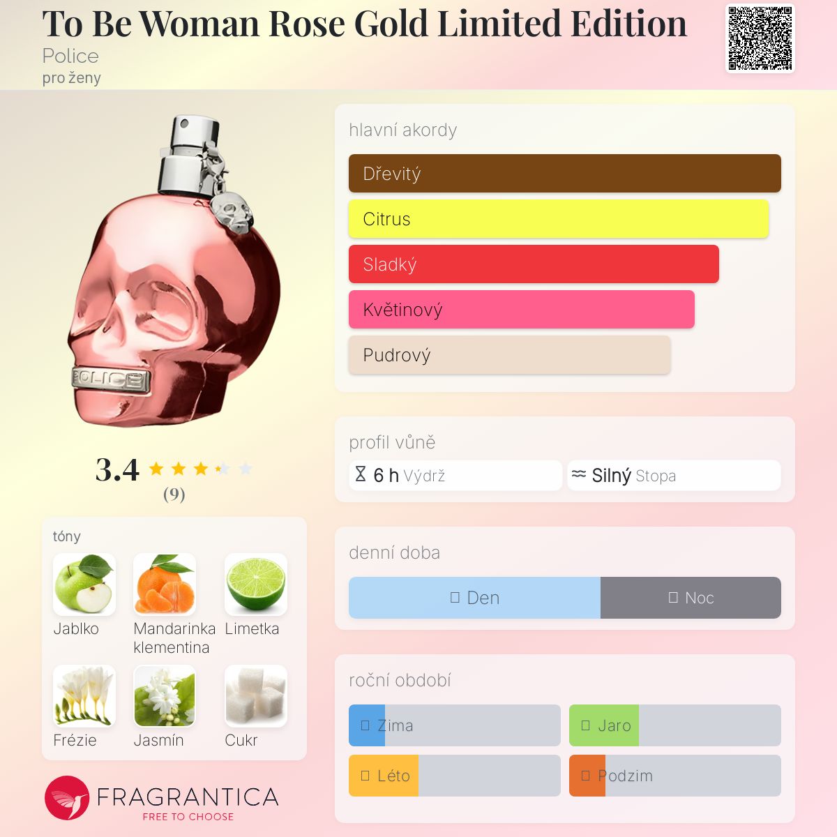To Be Woman Rose Gold Limited Edition podle Police je Floral Fruity vůně pro ženy. To Be Woman Rose Gold Limited Edition byl/a uveden/a v roce 2021. Vrchní tóny jsou Granny Smith jablko, Mandarinka klementina a Limetka; střední tóny jsouFrézie, Jasmín a Cukr ; základní tóny jsou Cedr, Santalové dřevo a Pižmo.