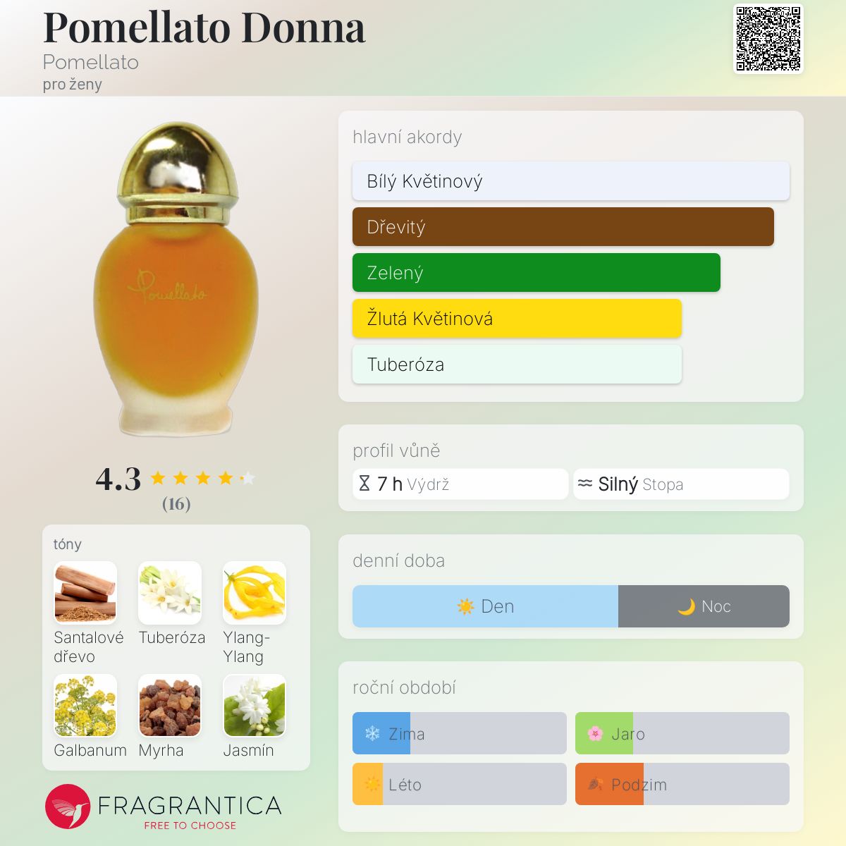 Pomellato Donna podle Pomellato je Orientální Floral vůně pro ženy. Pomellato Donna byl/a uveden/a v roce 1989. Vrchní tóny jsou Mandarinka a Grapefruit; střední tóny jsouTuberóza, Ylang-Ylang, Galbanum a Jasmín ; základní tóny jsou Santalové dřevo, Myrha a Pižmo.