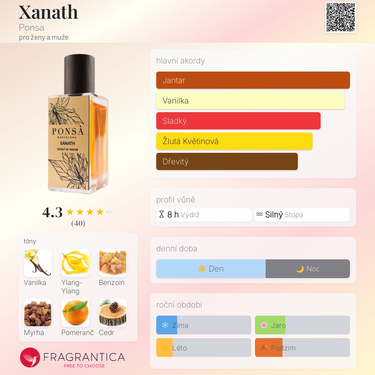 Xanath podle Ponsa je Orientální Floral vůně pro ženy a muže. Xanath byl/a uveden/a v roce 2021. "Nosem" za touto vůní je Alejandro Ponsà. Vrchní tóny jsou Pomeranč a Aldehydy; střední tón jeYlang-Ylang ; základní tóny jsou Madagaskarská vanilka, Benzoin, Myrha a Himalájský cedr.