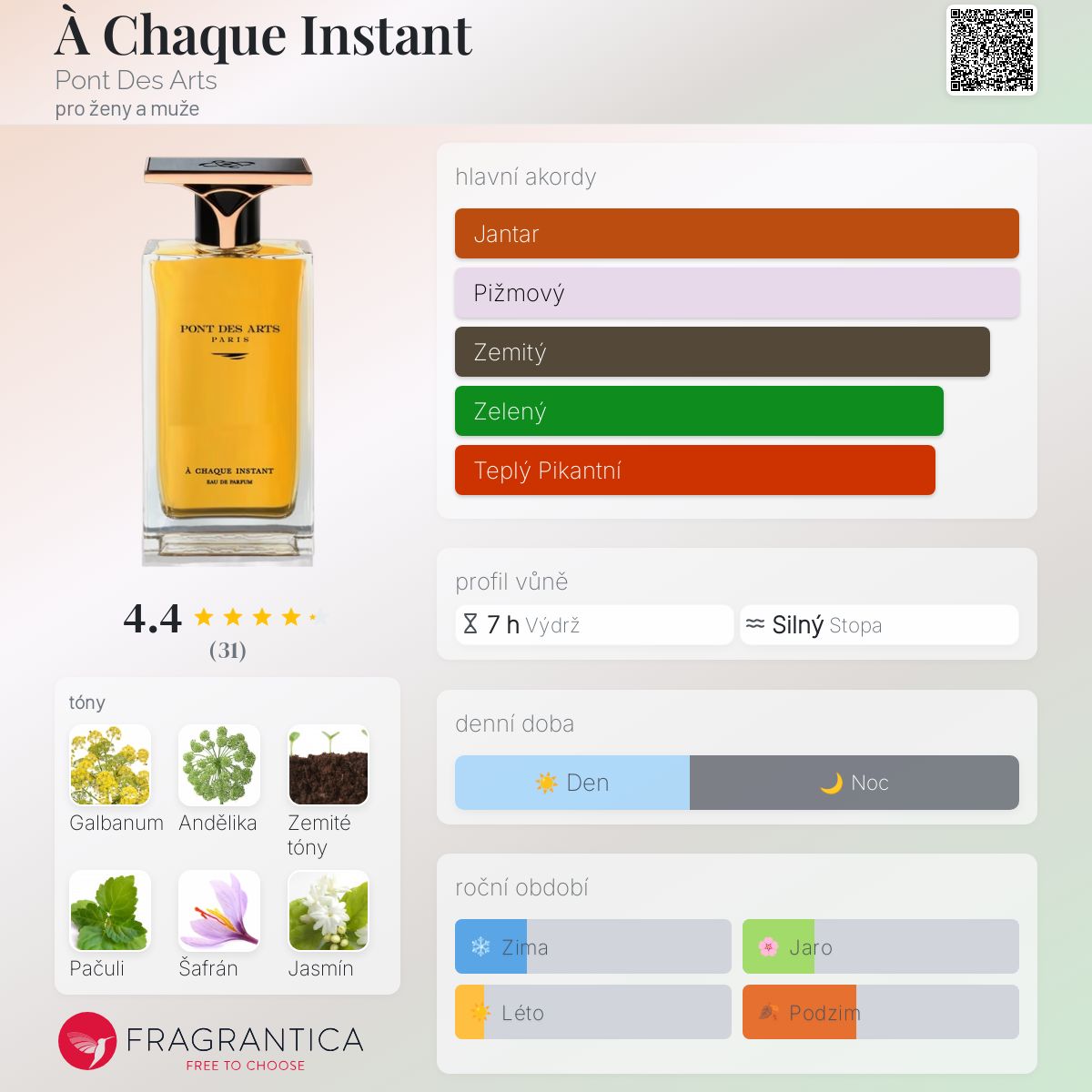 À Chaque Instant podle Pont Des Arts je Chypre vůně pro ženy a muže. À Chaque Instant byl/a uveden/a v roce 2017. "Nosem" za touto vůní je Bertrand Duchaufour. Vrchní tóny jsou Galbanum, Andělika, Šafrán, Mandarinka klementina a Růžový pepř; střední tóny jsouPačuli, Jasmín, Tuberóza a Včelí vosk ; základní tóny jsou Zemité tóny, Dubový mech, Pižmo, Siamský (thajský) benzoin, Vanilka a Myrha.