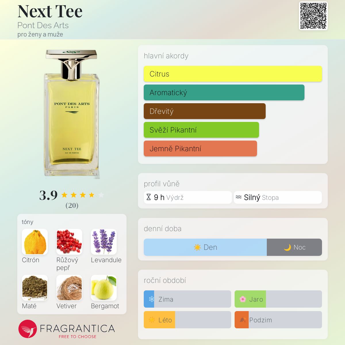 Next Tee podle Pont Des Arts je Citrus vůně pro ženy a muže. Next Tee byl/a uveden/a v roce 2019. "Nosem" za touto vůní je Bertrand Duchaufour. Vrchní tóny jsou Zedrát, Růžový pepř, Bergamot, Zelená mandarinka a Grapefruit; střední tóny jsouLevandule, Šalvěj muškátová, Kardamom a Jalovcové bobulky ; základní tóny jsou Maté, Vetiver, Virginský cedr a Pižmo.
