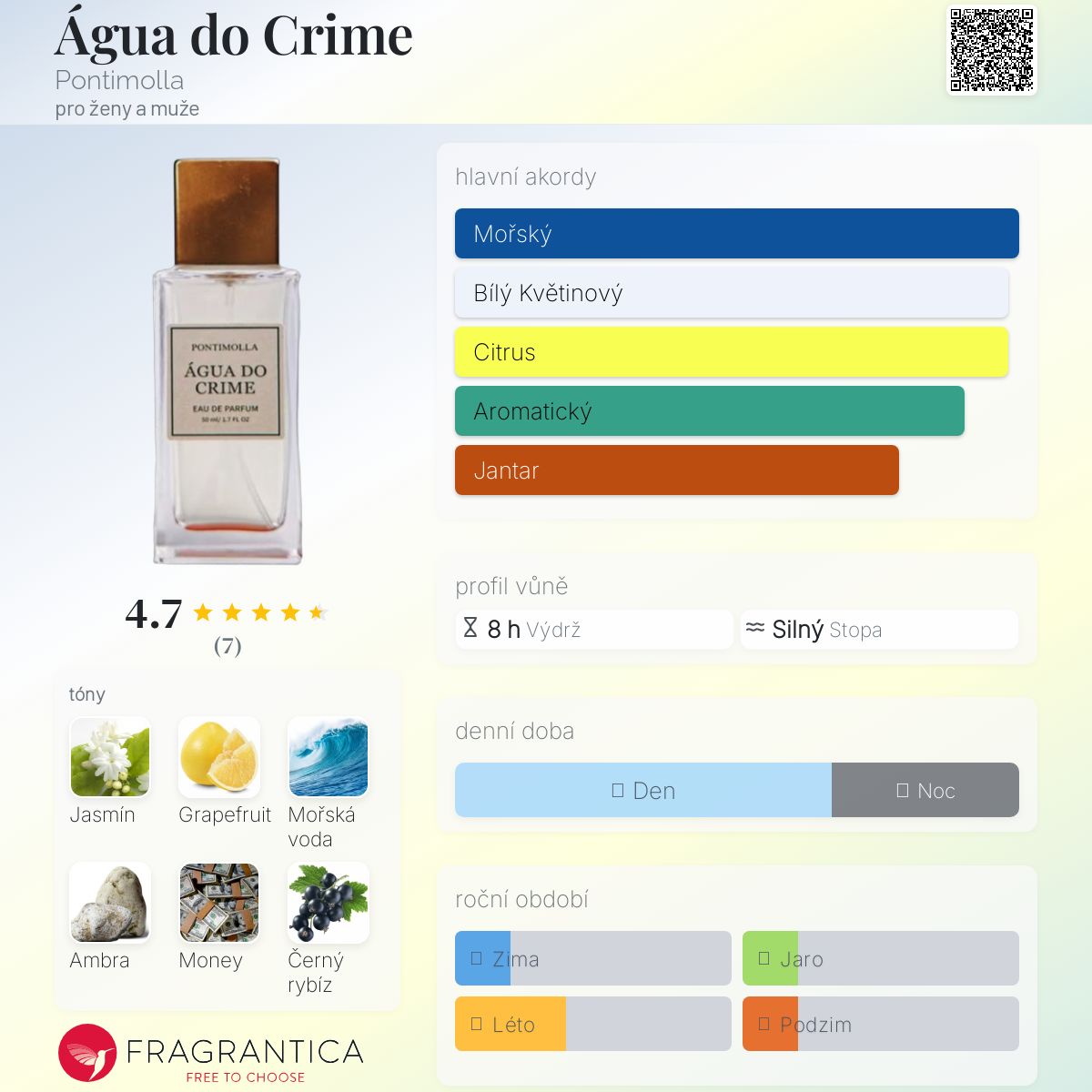 Água do Crime podle Pontimolla je Floral Aquatic vůně pro ženy a muže. Toto je nová vůně. Água do Crime byl/a uveden/a v roce 2025. Vrchní tóny jsou Jasmín a Peníze; střední tóny jsouGrapefruit, Černý rybíz a Vodní meloun ; základní tóny jsou Mořské tóny, Ambra a Cukr.