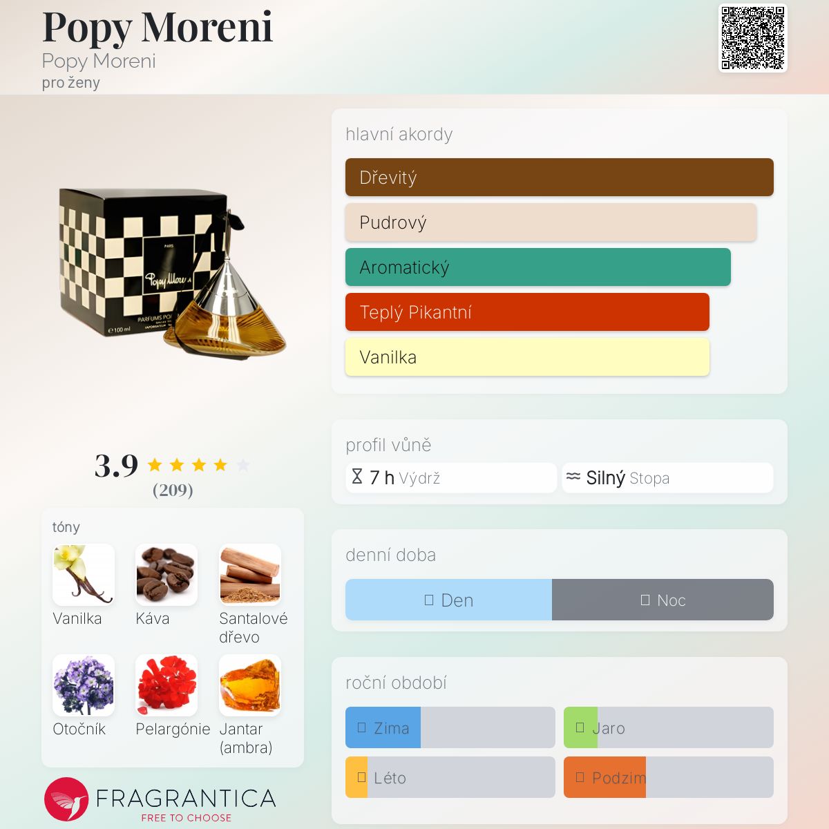 Popy Moreni podle Popy Moreni je Orientální Floral vůně pro ženy. Popy Moreni byl/a uveden/a v roce 1997. "Nosem" za touto vůní je Martin Gras. Vrchní tóny jsou Káva, Pelargónie, Ylang-Ylang a Bergamot; střední tóny jsouOtočník, Koriandr, Mimóza a Květ afrického pomeranče ; základní tóny jsou Vanilka, Santalové dřevo, Jantar (ambra), Pačuli, Styrax a Vetiver.
