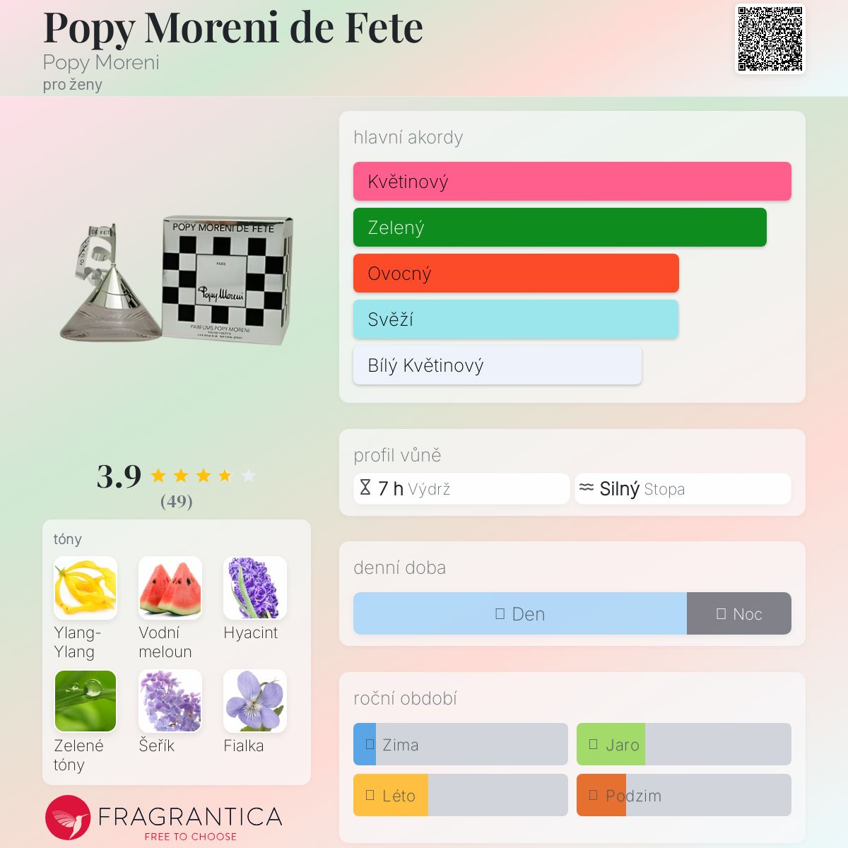 Popy Moreni de Fete podle Popy Moreni je Floral Fruity vůně pro ženy. Popy Moreni de Fete byl/a uveden/a v roce 1998. Vrchní tóny jsou Ylang-Ylang, Vodní meloun, Zelené tóny, Černý rybíz, Švestka, Broskev, Bergamot, Citronová verbena a Citron amalfi; střední tóny jsouHyacint, Šeřík, Fialka, Konvalinka, Brambořík, Jasmín a Růže ; základní tóny jsou Pižmo, Santalové dřevo, Dubový mech a Jantar (ambra).