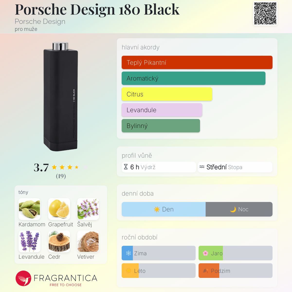 Porsche Design 180 Black podle Porsche Design je Woody Aromatic vůně pro muže. "Nosem" za touto vůní je Christian Plesch. Vrchní tóny jsou Kardamom a Grapefruit; střední tóny jsouŠalvěj a Levandule ; základní tóny jsou Cedr a Vetiver.