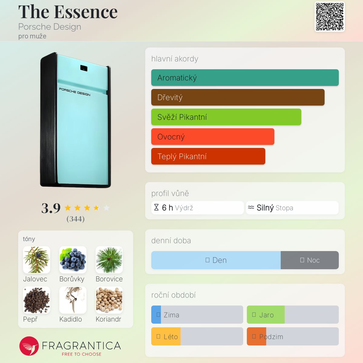 The Essence podle Porsche Design je vůně pro muže. The Essence byl/a uveden/a v roce 2008. The Essence byl/a vytvořen/a Bruno Jovanovic a Anne Flipo. Vrchní tóny jsou Jalovec a Borůvky; střední tóny jsouBorovice, Pepř a Koriandr ; základní tóny jsou Kadidlo a Pačuli.