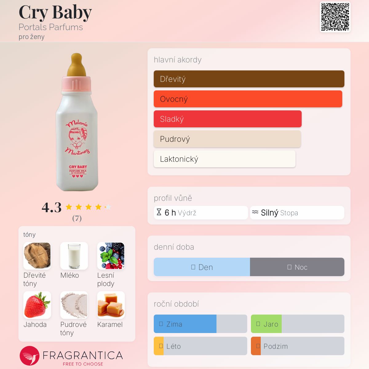 Cry Baby podle Portals Parfums je Orientální Vanilla vůně pro ženy. Toto je nová vůně. Cry Baby byl/a uveden/a v roce 2025. "Nosem" za touto vůní je Catherine Selig. Vrchní tóny jsou Mléko, Lesní plody, Rtěnka a Jahoda; střední tón jePudrové tóny ; základní tóny jsou Dřevité tóny a Karamel.