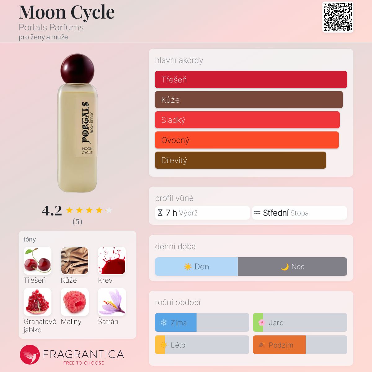 Moon Cycle podle Portals Parfums je Orientální Spicy vůně pro ženy a muže. Toto je nová vůně. Moon Cycle byl/a uveden/a v roce 2025. Vrchní tóny jsou Třešeň, Granátové jablko a Maliny; střední tóny jsouKrev, Šafrán a Černý pepř ; základní tóny jsou Kůže, Pačuli, Kašmír, Jantar (ambra) a Vanilka.