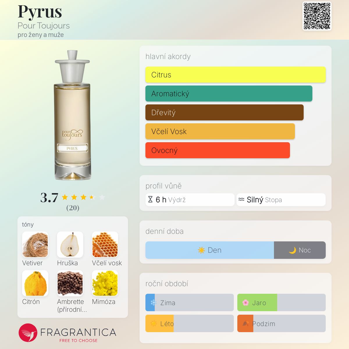 Pyrus podle Pour Toujours je Citrus Aromatic vůně pro ženy a muže. Pyrus byl/a uveden/a v roce 2015. "Nosem" za touto vůní je Martine Denisot.
