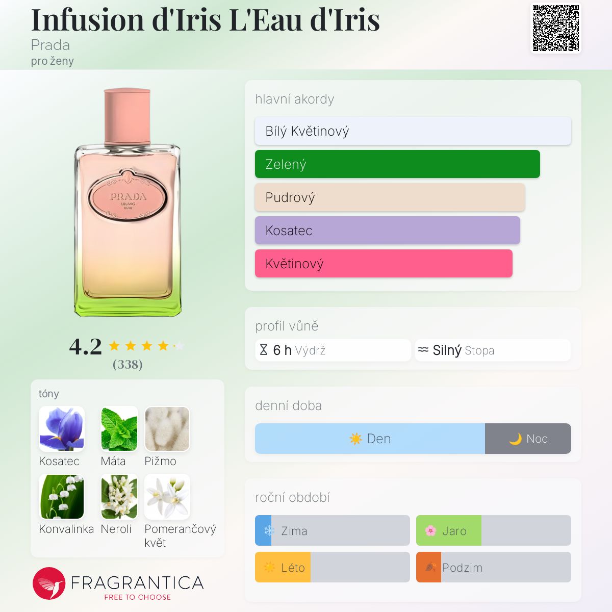 Infusion d'Iris L'Eau d'Iris podle Prada je Floral Woody Musk vůně pro ženy. Infusion d'Iris L'Eau d'Iris byl/a uveden/a v roce 2013. "Nosem" za touto vůní je Daniela Andrier. Vrchní tóny jsou Máta a Tuniské neroli; střední tóny jsouKosatec, Konvalinka, Pomerančový květ, Růžový oleandr a Růže ; základní tóny jsou Bílé pižmo, Dřevité tóny a Vanilka.