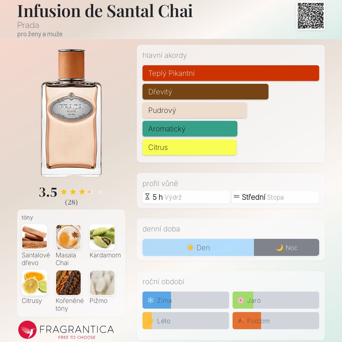 Infusion de Santal Chai podle Prada je Woody Spicy vůně pro ženy a muže. Toto je nová vůně. Infusion de Santal Chai byl/a uveden/a v roce 2026. Vrchní tóny jsou Kardamom a Citrusy; střední tóny jsouMasala Chai, Koření a Mléko ; základní tóny jsou Santalové dřevo a Pižmo.