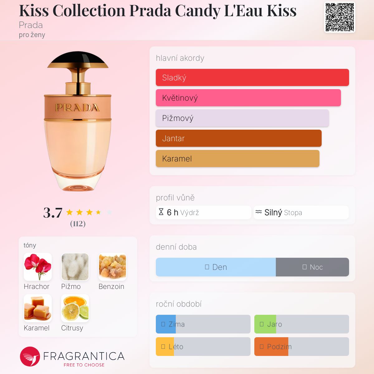 Kiss Collection Prada Candy L'Eau Kiss podle Prada je Orientální Vanilla vůně pro ženy. Kiss Collection Prada Candy L'Eau Kiss byl/a uveden/a v roce 2015. "Nosem" za touto vůní je Daniela Andrier. Vrchní tón je Citrusy ; střední tón jeHrachor ; základní tóny jsou Pižmo, Benzoin a Karamel.