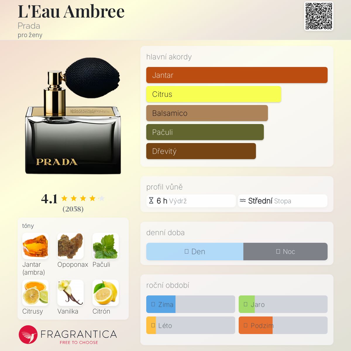 L'Eau Ambree podle Prada je Orientální Floral vůně pro ženy. L'Eau Ambree byl/a uveden/a v roce 2009. "Nosem" za touto vůní je Daniela Andrier. Vrchní tóny jsou Citrusy a Citron amalfi; střední tóny jsouPačuli a Růže ; základní tóny jsou Jantar (ambra), Opoponax a Vanilka.