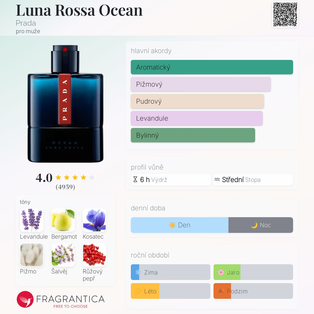 luna rossa ocean je velmi dobře sestavený aromatický fougére parfém, se sladším podtónem, ale vůbec ne gurmánský, je to parfém, který připomíná čistého a upraveného člověka na běžný výlet, pozdní odpoledne nebo i večer.