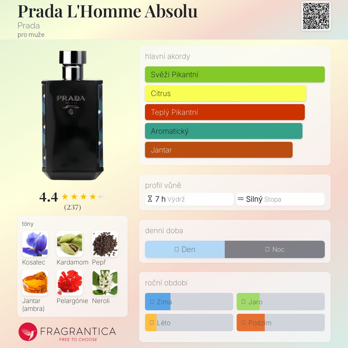 Prada L'Homme Absolu podle Prada je Orientální Woody vůně pro muže. Prada L'Homme Absolu byl/a uveden/a v roce 2018. "Nosem" za touto vůní je Daniela Andrier. Vrchní tóny jsou Kardamom, Černý pepř, Zelená mandarinka a Bergamot; střední tóny jsouKosatec, Pelargónie a Neroli ; základní tóny jsou Jantar (ambra), Labdanum a Cedr.