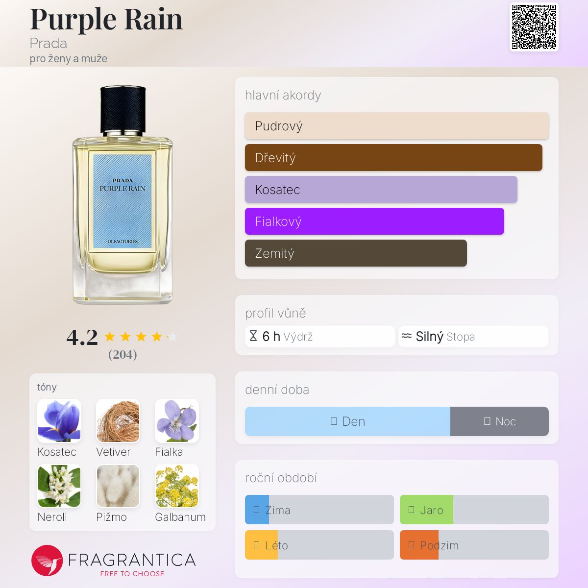Purple Rain podle Prada je Floral Woody Musk vůně pro ženy a muže. Purple Rain byl/a uveden/a v roce 2015. "Nosem" za touto vůní je Daniela Andrier. Vrchní tóny jsou Galbanum a Bergamot; střední tóny jsouKosatec, Neroli, Hedione a Růže ; základní tóny jsou Vetiver, Fialka, Bílé pižmo, Iso E Super, Cedr a Santalové dřevo.