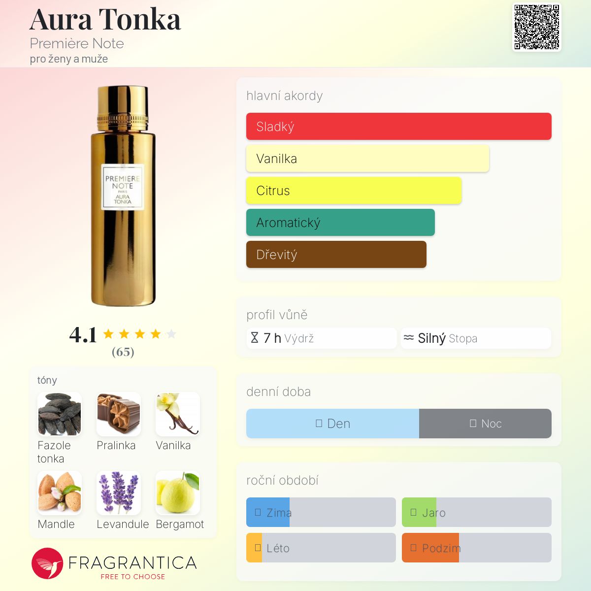 Aura Tonka podle Première Note je Orientální Woody vůně pro ženy a muže. Aura Tonka byl/a uveden/a v roce 2017. "Nosem" za touto vůní je Jérôme di Marino. Vrchní tóny jsou Mandle, Bergamot a Mandarinka; střední tóny jsouLevandule, Karamela, Jasmín a Solární tóny ; základní tóny jsou Fazole tonka, Pralinka, Vanilka, Santalové dřevo a Orris.