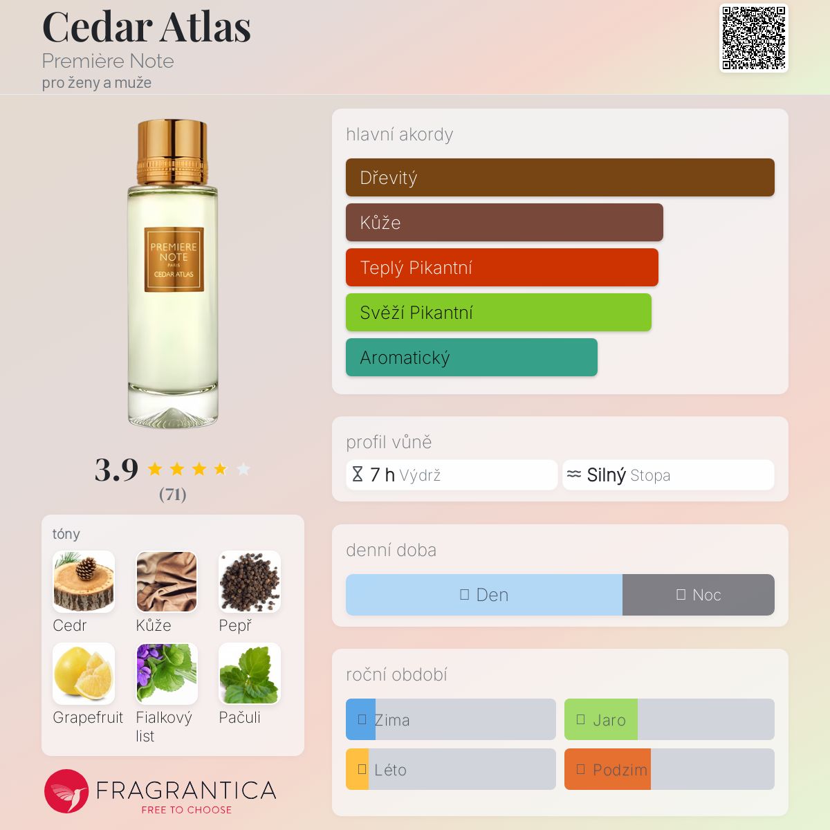 Cedar Atlas podle Première Note je Woody Aromatic vůně pro ženy a muže. "Nosem" za touto vůní je Mélanie Leroux. Vrchní tóny jsou Indický pepř, Grapefruit a Kardamom; střední tóny jsouFialkový list, Egyptský jasmín a Bulharská růže ; základní tóny jsou Atlasový cedr, Kůže a List indonéského pačuli.