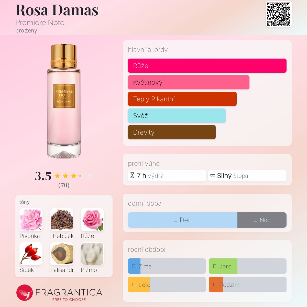 Rosa Damas podle Première Note je Floral vůně pro ženy. "Nosem" za touto vůní je Mélanie Leroux. Vrchní tóny jsou Madagaskarský hřebíček, Šípek a Drobné ovoce; střední tóny jsouPivoňka, Damašská růže a Egyptský jasmín ; základní tóny jsou Palisandr, Bílé pižmo a Jantar (ambra).