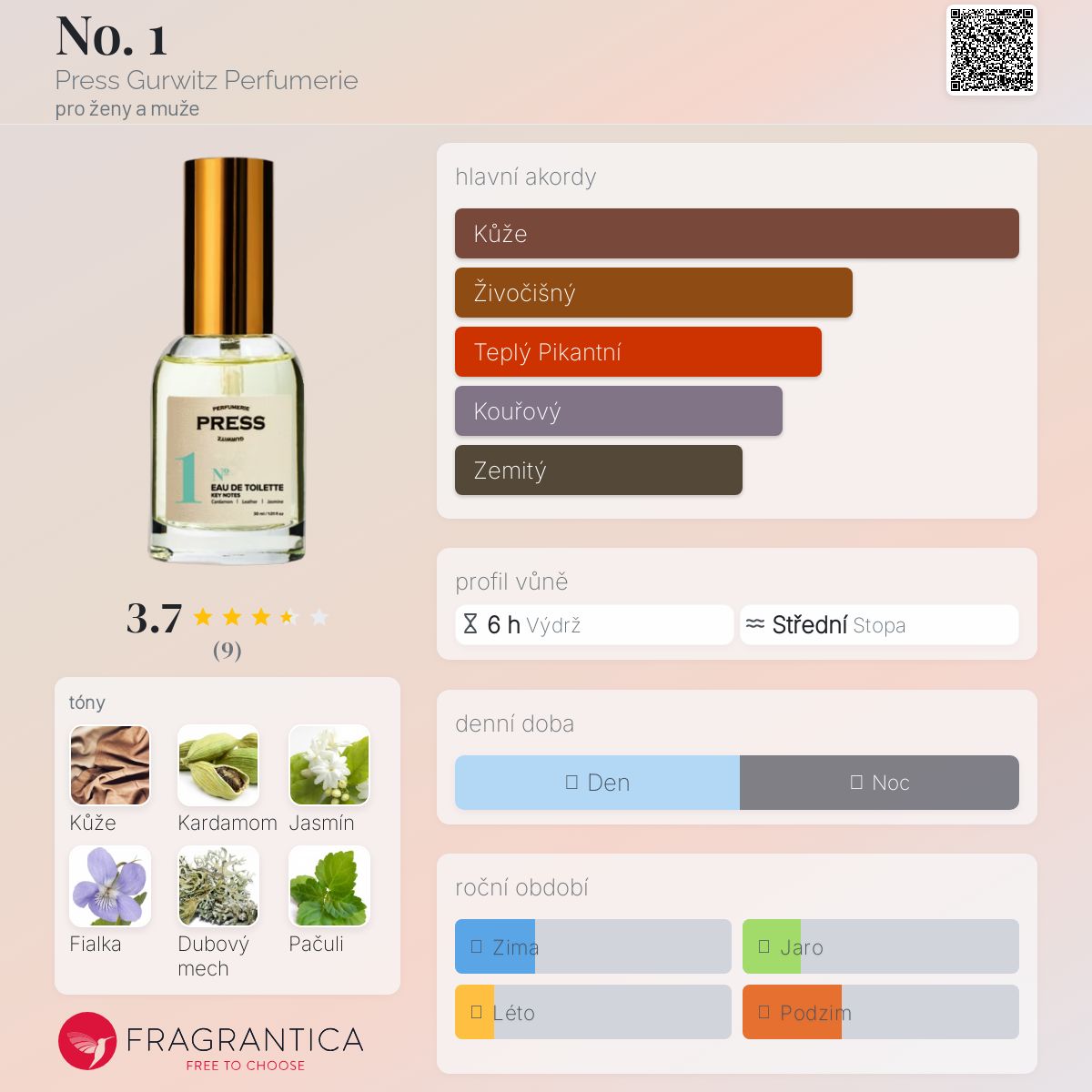 No. 1 podle Press Gurwitz Perfumerie je vůně pro ženy a muže. No. 1 byl/a uveden/a v roce 2023. Vrchní tón je Kardamom ; střední tóny jsouJasmín a Fialka ; základní tóny jsou Kůže, Dubový mech a Pačuli.