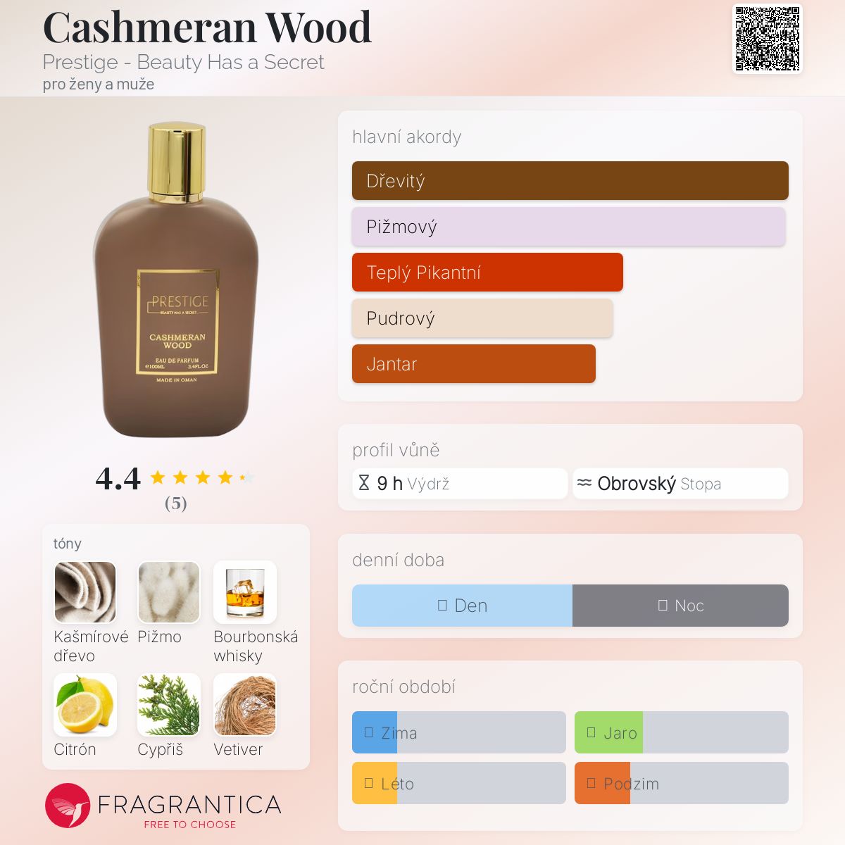 Cashmeran Wood podle Prestige - Beauty Has a Secret je Woody vůně pro ženy a muže. Cashmeran Wood byl/a uveden/a v roce 2023. "Nosem" za touto vůní je Bhupinder Singh Badh Sunny. Vrchní tóny jsou Citrón a Cypřiš; střední tóny jsouBourbonská whisky a Haitský vetiver ; základní tóny jsou Kašmírové dřevo a Pižmo.