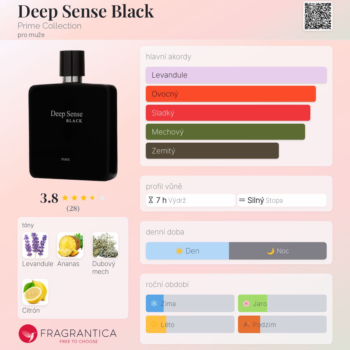 Deep Sense Black podle Prime Collection je Aromatic Fruity vůně pro muže. Vrchní tóny jsou Levandule a Citrón; střední tón jeAnanas ; základní tón je Mech.