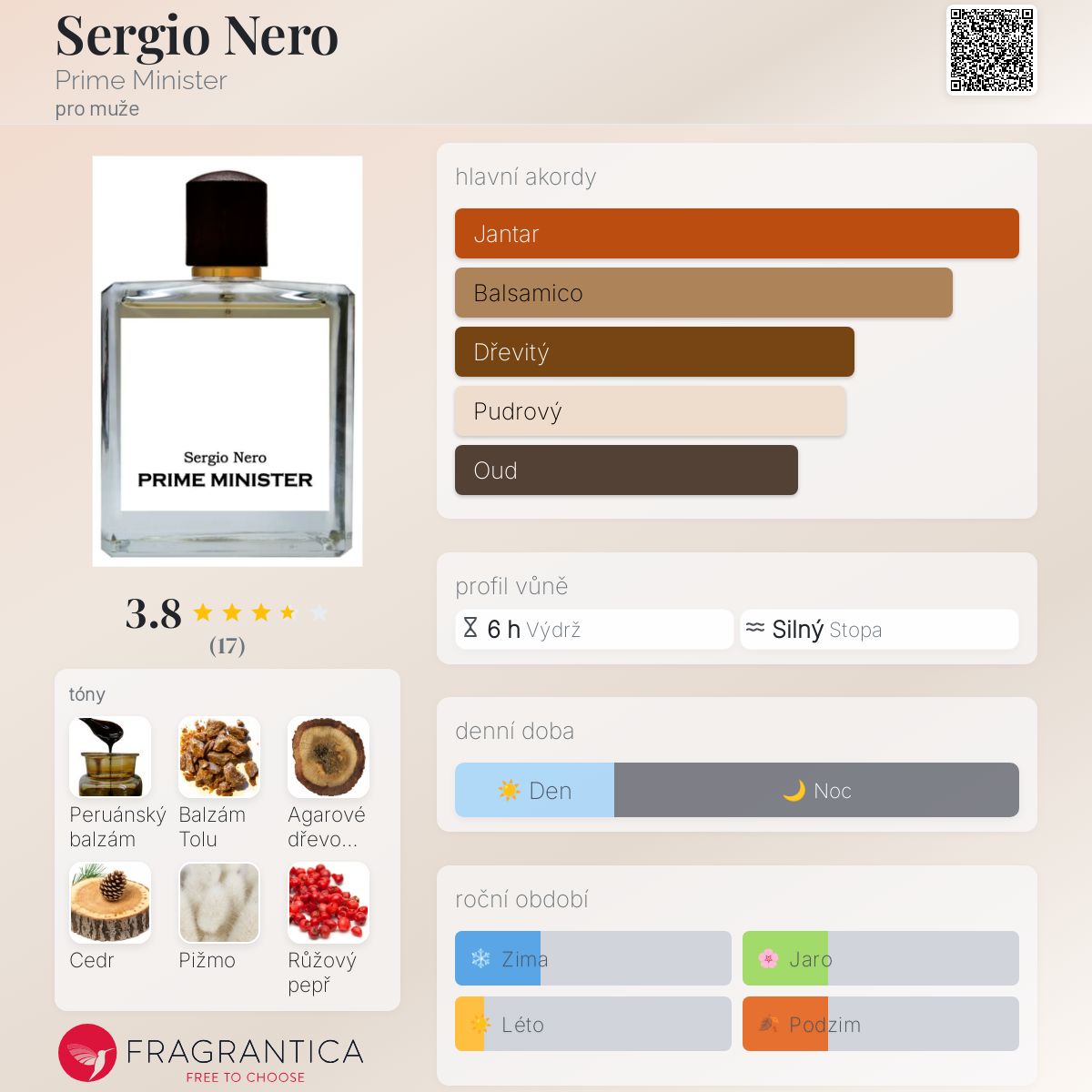Sergio Nero podle Prime Minister je vůně pro muže. Sergio Nero byl/a uveden/a v roce 2021. "Nosem" za touto vůní je Eric Fracapane. Vrchní tóny jsou Peruánský balzám, Růžový pepř a Kadidlo; střední tóny jsouAgarové dřevo (oud) a Cedr ; základní tóny jsou Balzám Tolu, Pižmo a Pačuli.