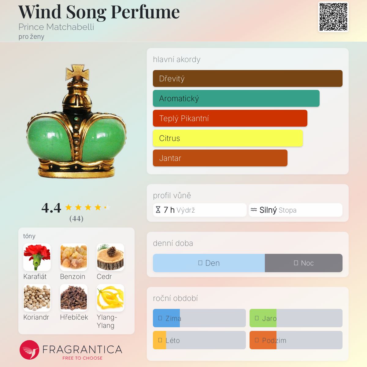 Wind Song Perfume podle Prince Matchabelli je Floral vůně pro ženy. Wind Song Perfume byl/a uveden/a v roce 1953. Vrchní tóny jsou Koriandr, Estragon, Mandarinka, Pomerančový list, Neroli, Bergamot a Citrusy; střední tóny jsouKarafiát, Hřebíček, Ylang-Ylang, Palisandr, Jasmín, Růže a Kořen orris ; základní tóny jsou Benzoin, Cedr, Santalové dřevo, Vetiver, Jantar (ambra) a Pižmo.