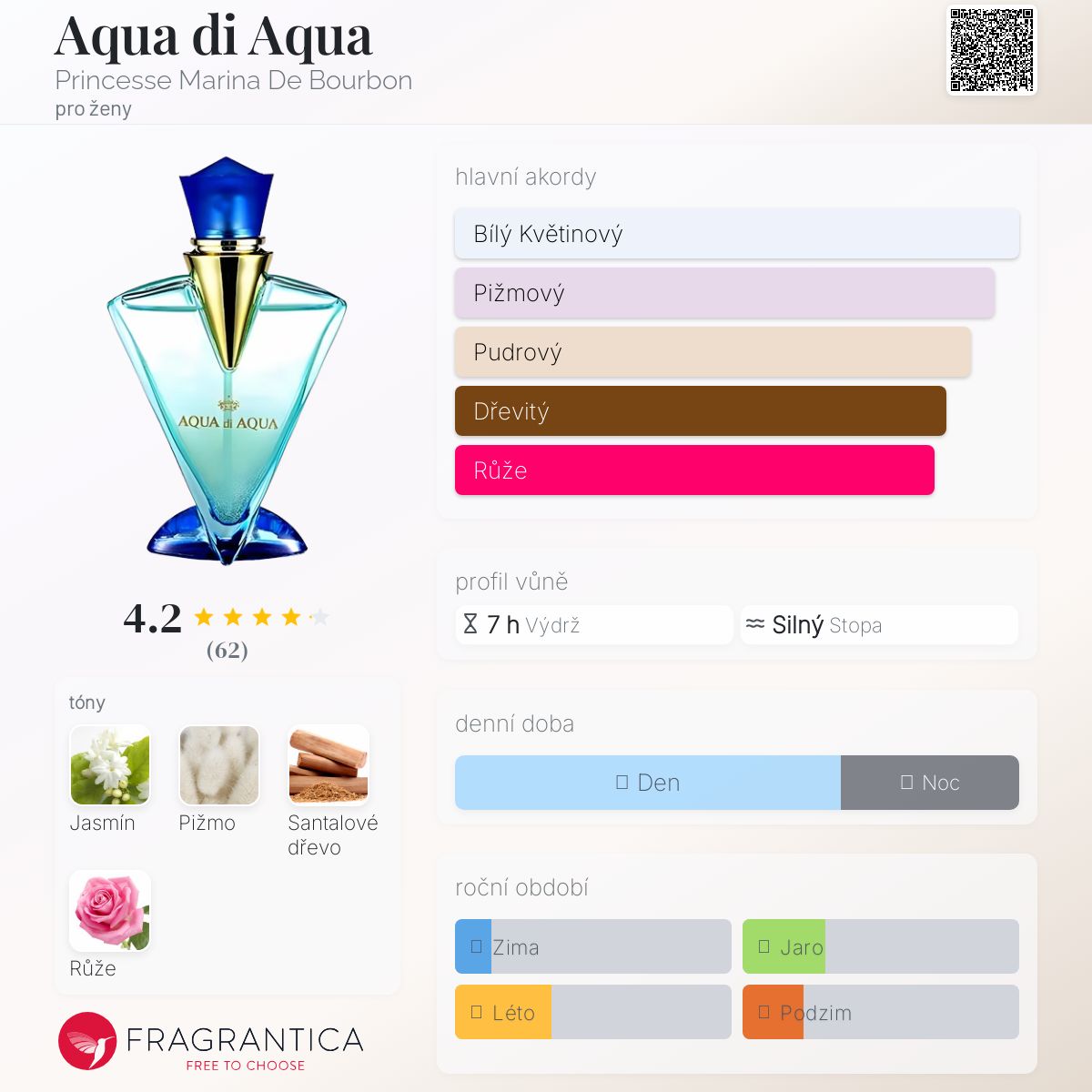 Aqua di Aqua podle Princesse Marina De Bourbon je Floral vůně pro ženy. Aqua di Aqua byl/a uveden/a v roce 2000. střední tóny jsouJasmín a Růže ; základní tóny jsou Pižmo a Santalové dřevo.