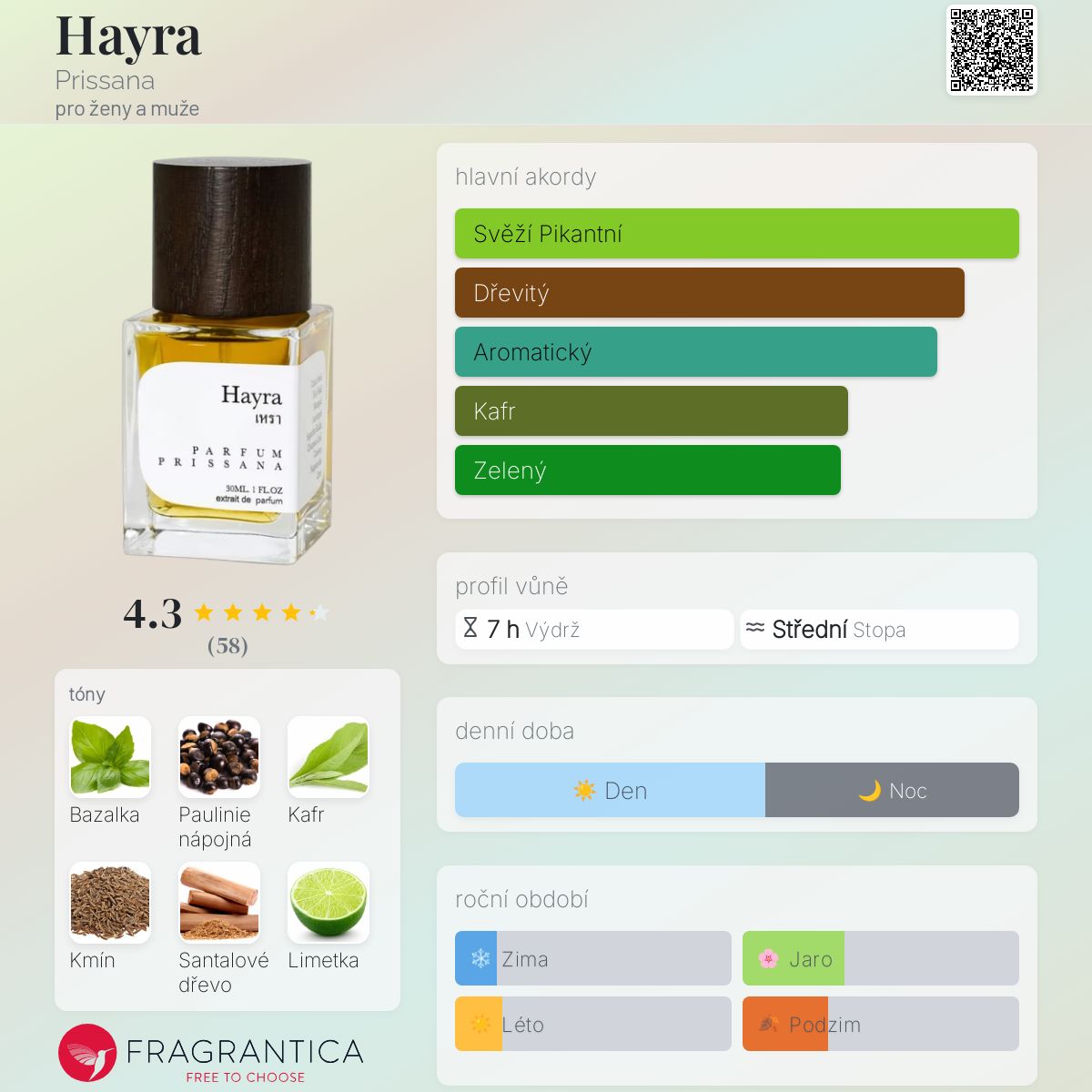 Hayra podle Prissana je Orientální Spicy vůně pro ženy a muže. Hayra byl/a uveden/a v roce 2020. "Nosem" za touto vůní je Prin Lomros.