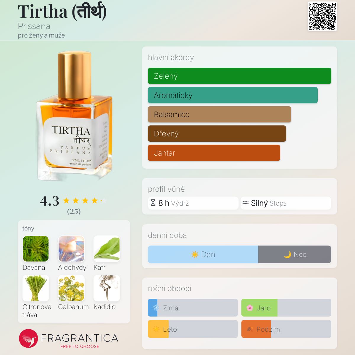 Tirtha (तीर्थ) podle Prissana je Floral Green vůně pro ženy a muže. Toto je nová vůně. Tirtha (तीर्थ) byl/a uveden/a v roce 2024. "Nosem" za touto vůní je Prin Lomros.