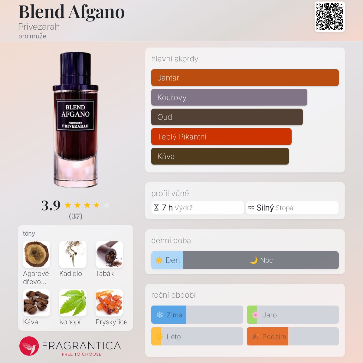 Blend Afgano podle Privezarah je Woody Aquatic vůně pro muže. Blend Afgano byl/a uveden/a v roce 2020. Vrchní tóny jsou Konopí a Zelené tóny; střední tóny jsouTabák, Káva a Pryskyřice ; základní tóny jsou Agarové dřevo (oud) a Kadidlo.