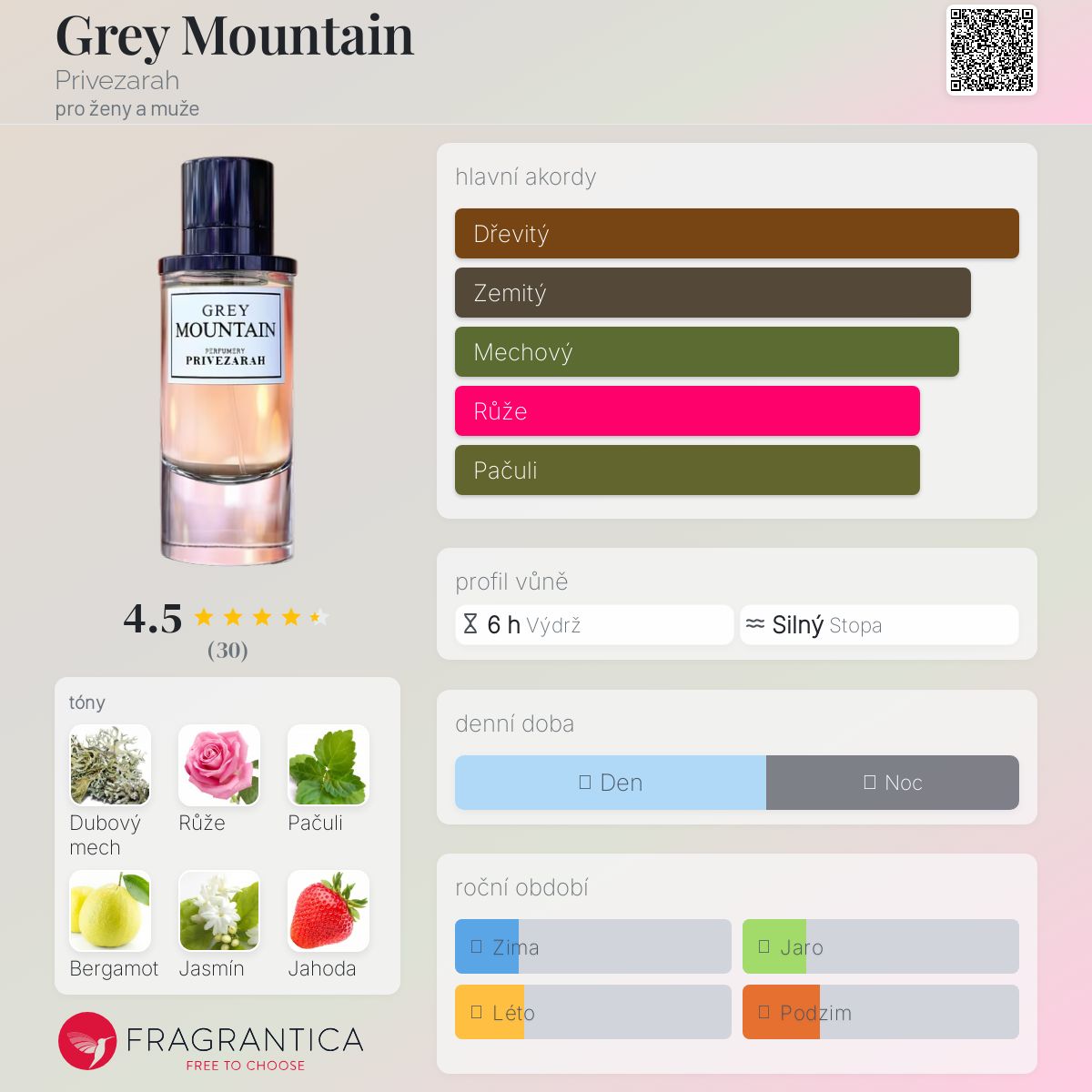 Grey Mountain podle Privezarah je Orientální Floral vůně pro ženy a muže. Grey Mountain byl/a uveden/a v roce 2020. Vrchní tóny jsou Bergamot a Grapefruit; střední tóny jsouRůže, Jasmín, Jahoda, Pomerančový květ a Ylang-Ylang ; základní tóny jsou Dubový mech, Pačuli, Bílé pižmo, Santalové dřevo, Cedr a Jantar (ambra).