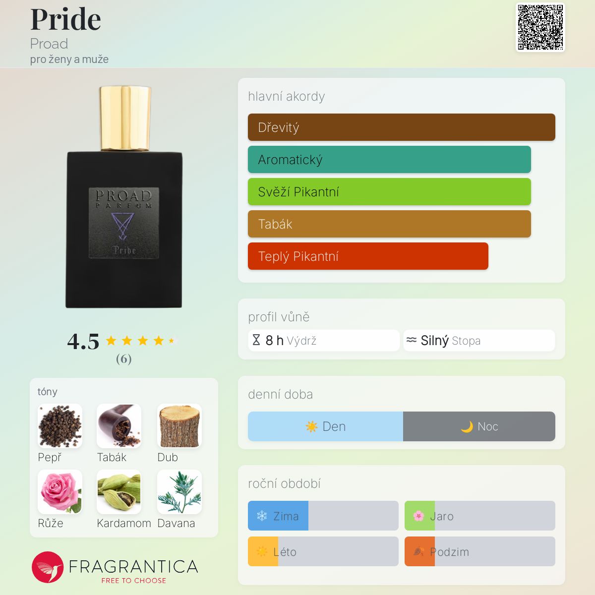 Pride podle Proad je Woody Spicy vůně pro ženy a muže. Toto je nová vůně. Pride byl/a uveden/a v roce 2025. "Nosem" za touto vůní je Dominique Ropion. Vrchní tóny jsou Černý pepř, Kardamom, Maliny a Likér; střední tóny jsouTurecká růže, Davana a Inkoust ; základní tóny jsou Tabák, Dub a Vetiver.