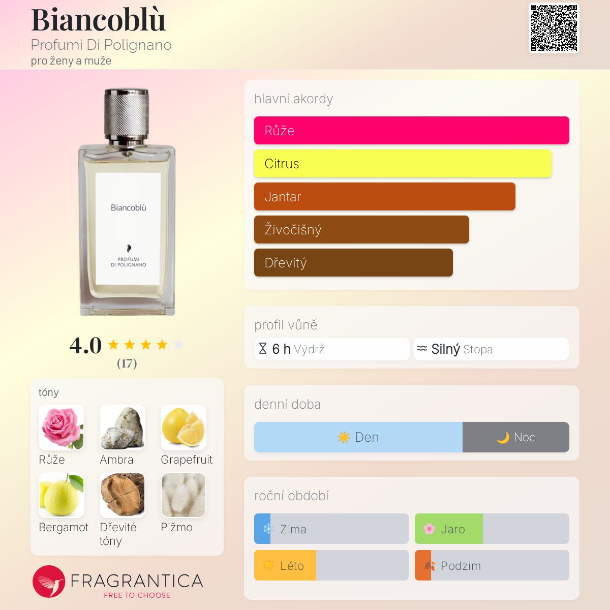 Biancoblù podle Profumi Di Polignano je vůně pro ženy a muže. Biancoblù byl/a uveden/a v roce 2018. "Nosem" za touto vůní je Arturetto Landi. Vrchní tóny jsou Grapefruit, Bergamot a Mořská řasa; střední tóny jsouRůže, Dřevité tóny a Ylang-Ylang ; základní tóny jsou Růže, Ambra a Pižmo.