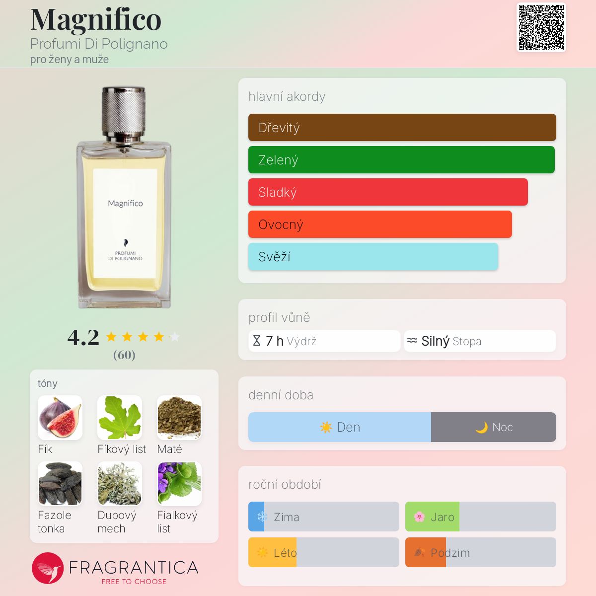 Magnifico podle Profumi Di Polignano je vůně pro ženy a muže. Magnifico byl/a uveden/a v roce 2018. "Nosem" za touto vůní je Arturetto Landi. Vrchní tóny jsou Fík a Maté; střední tóny jsouFíkový list, Fialkový list, Bezinka, Jasmín, Růže a Kosatec ; základní tóny jsou Fík, Fazole tonka, Dubový mech, Vanilka, Santalové dřevo a Cedr.
