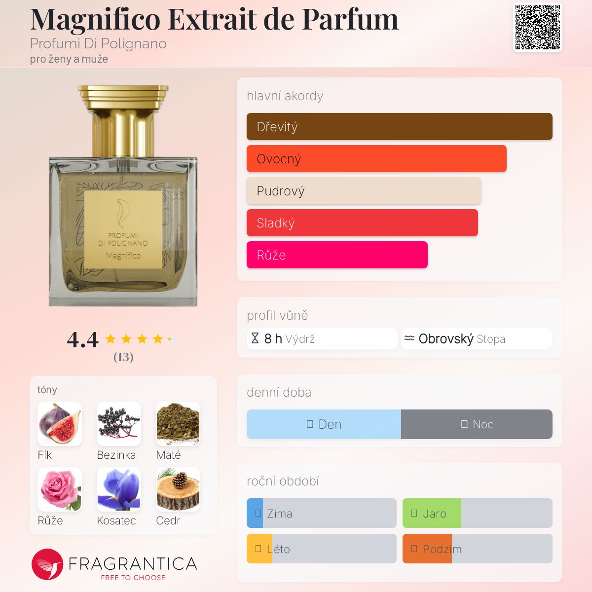 Magnifico Extrait de Parfum podle Profumi Di Polignano je vůně pro ženy a muže. Magnifico Extrait de Parfum byl/a uveden/a v roce 2022. "Nosem" za touto vůní je Arturetto Landi. Vrchní tóny jsou Fík a Maté; střední tóny jsouBezinka, Růže, Kosatec, Fialkový list, Jasmín a Konvalinka ; základní tóny jsou Cedr, Santalové dřevo, Bílé pižmo, Fazole tonka a Vanilka.