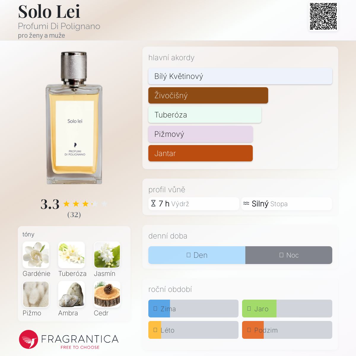 Solo Lei podle Profumi Di Polignano je vůně pro ženy a muže. Solo Lei byl/a uveden/a v roce 2018. "Nosem" za touto vůní je Arturetto Landi. Vrchní tóny jsou Gardénie, Kokos, Broskev a Švestka; střední tóny jsouGardénie, Tuberóza a Jasmín ; základní tóny jsou Pižmo, Ambra a Cedr.