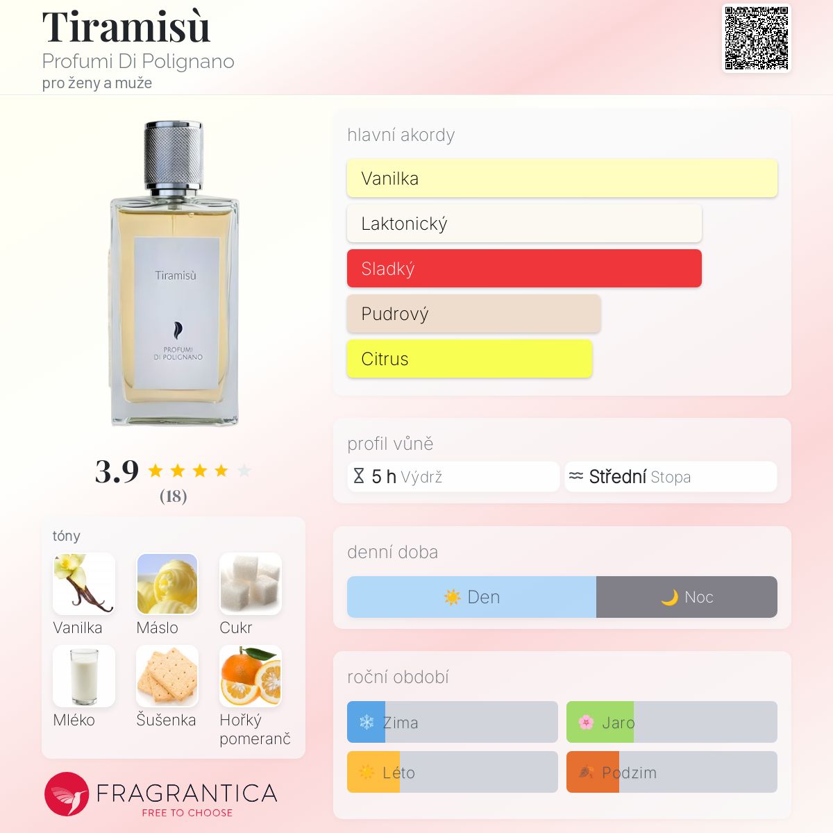 Tiramisù podle Profumi Di Polignano je Orientální Vanilla vůně pro ženy a muže. Toto je nová vůně. Tiramisù byl/a uveden/a v roce 2025. "Nosem" za touto vůní je Simone Lo Bue. Vrchní tóny jsou Hořký pomeranč a Plumérie; střední tóny jsouMáslo, Cukr a Mléko ; základní tóny jsou Vanilka, Šušenka a Bílé pižmo.