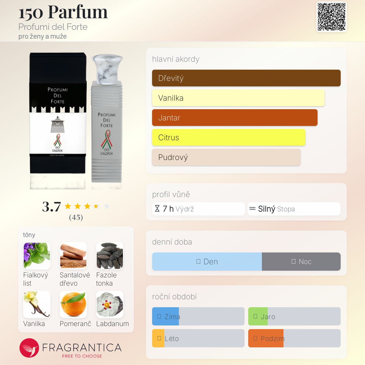 150 Parfum podle Profumi del Forte je Woody Aromatic vůně pro ženy a muže. 150 Parfum byl/a uveden/a v roce 2011. Vrchní tóny jsou Fialkový list, Pomeranč, Francouzské labdanum a Bergamot; střední tóny jsouSantalové dřevo, Pačuli a Virginský cedr ; základní tóny jsou Fazole tonka, Vanilka, Pižmo a Jantar (ambra).