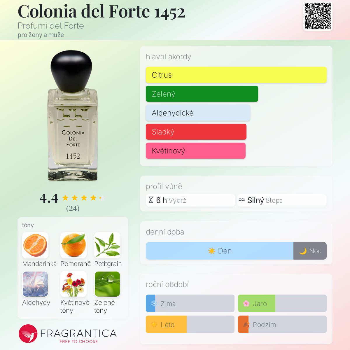 Colonia del Forte 1452 podle Profumi del Forte je Citrus Aromatic vůně pro ženy a muže. Colonia del Forte 1452 byl/a uveden/a v roce 2011. Vrchní tóny jsou Mandarinka, Pomeranč a Aldehydy; střední tóny jsouPetitgrain a Květinové tóny ; základní tón je Zelené tóny.