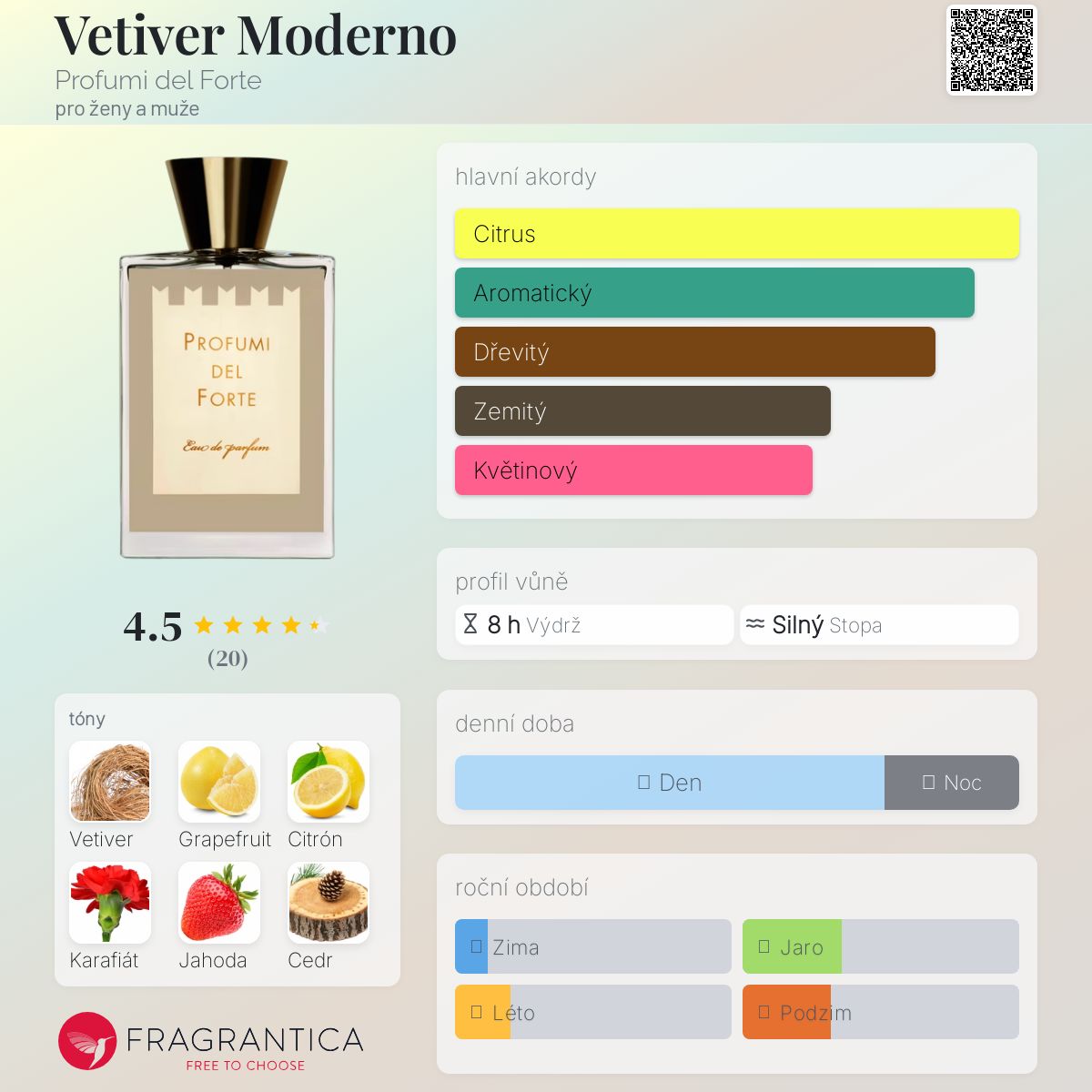 Vetiver Moderno podle Profumi del Forte je Chypre vůně pro ženy a muže. Vetiver Moderno byl/a uveden/a v roce 2017. "Nosem" za touto vůní je Arturetto Landi. Vrchní tóny jsou Grapefruit, Citrón a Jahoda; střední tóny jsouKarafiát, Konvalinka, Kosatec, Levandule, Jasmín a Růže ; základní tóny jsou Vetiver, Cedr, Bílé pižmo a Ambra.