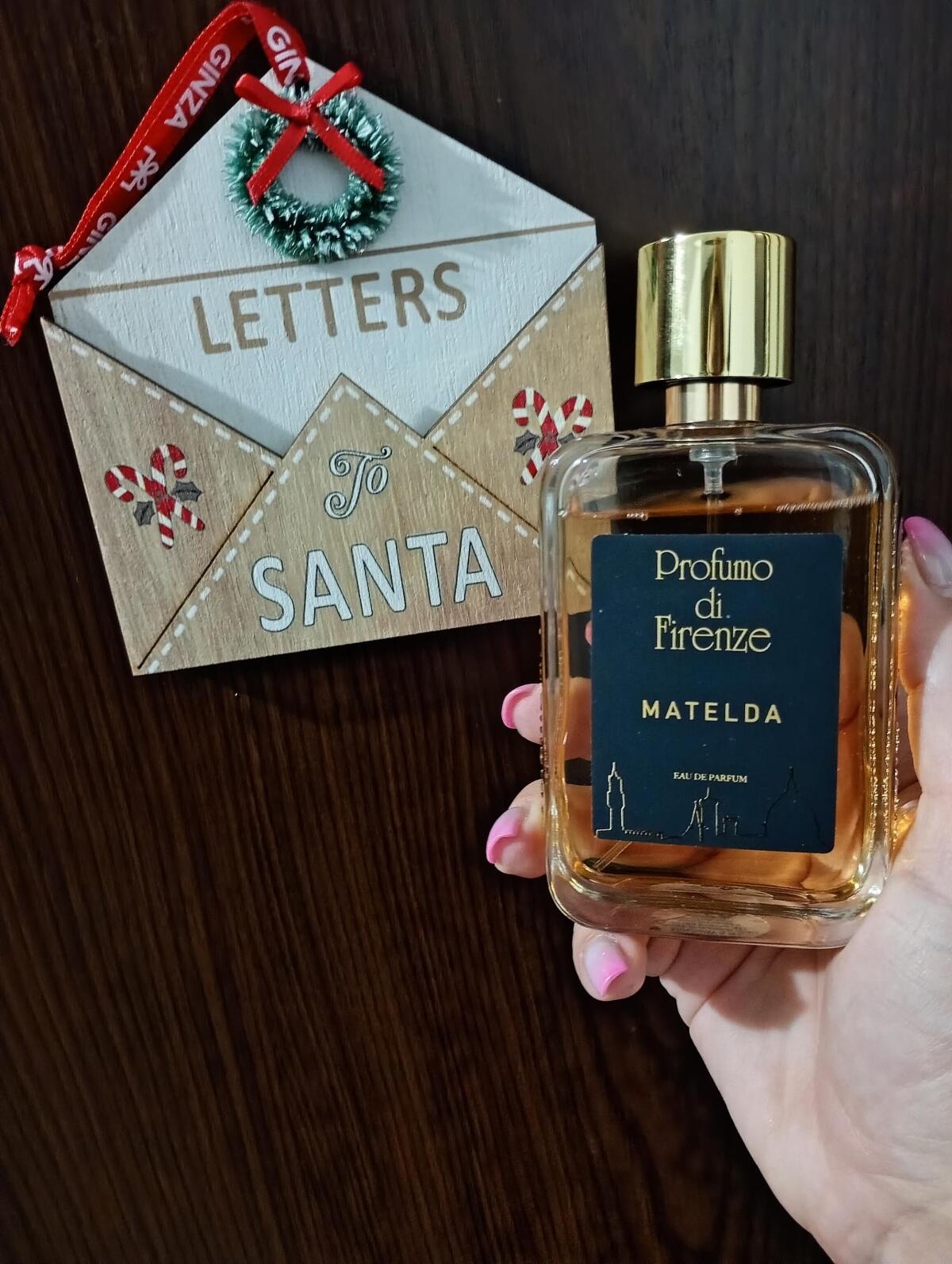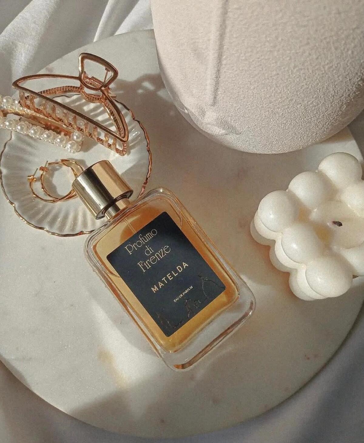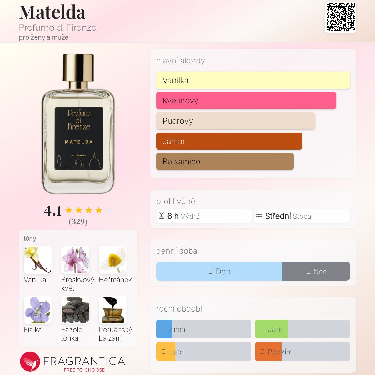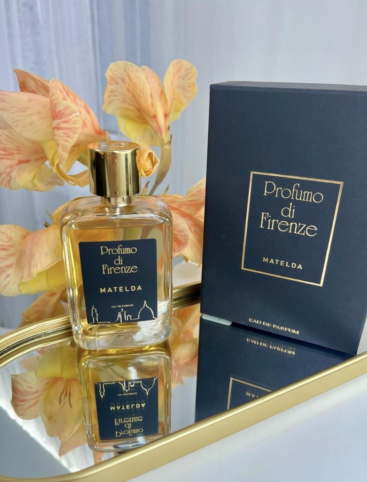 Matelda podle Profumo di Firenze je vůně pro ženy a muže. Matelda byl/a uveden/a v roce 2022. Vrchní tóny jsou Broskvový květ a Bílý grapefruit; střední tóny jsouHeřmánek, Fialka, Peruánský balzám a Benzoin ; základní tóny jsou Vanilka, Fazole tonka, Santalové dřevo a Pižmo.