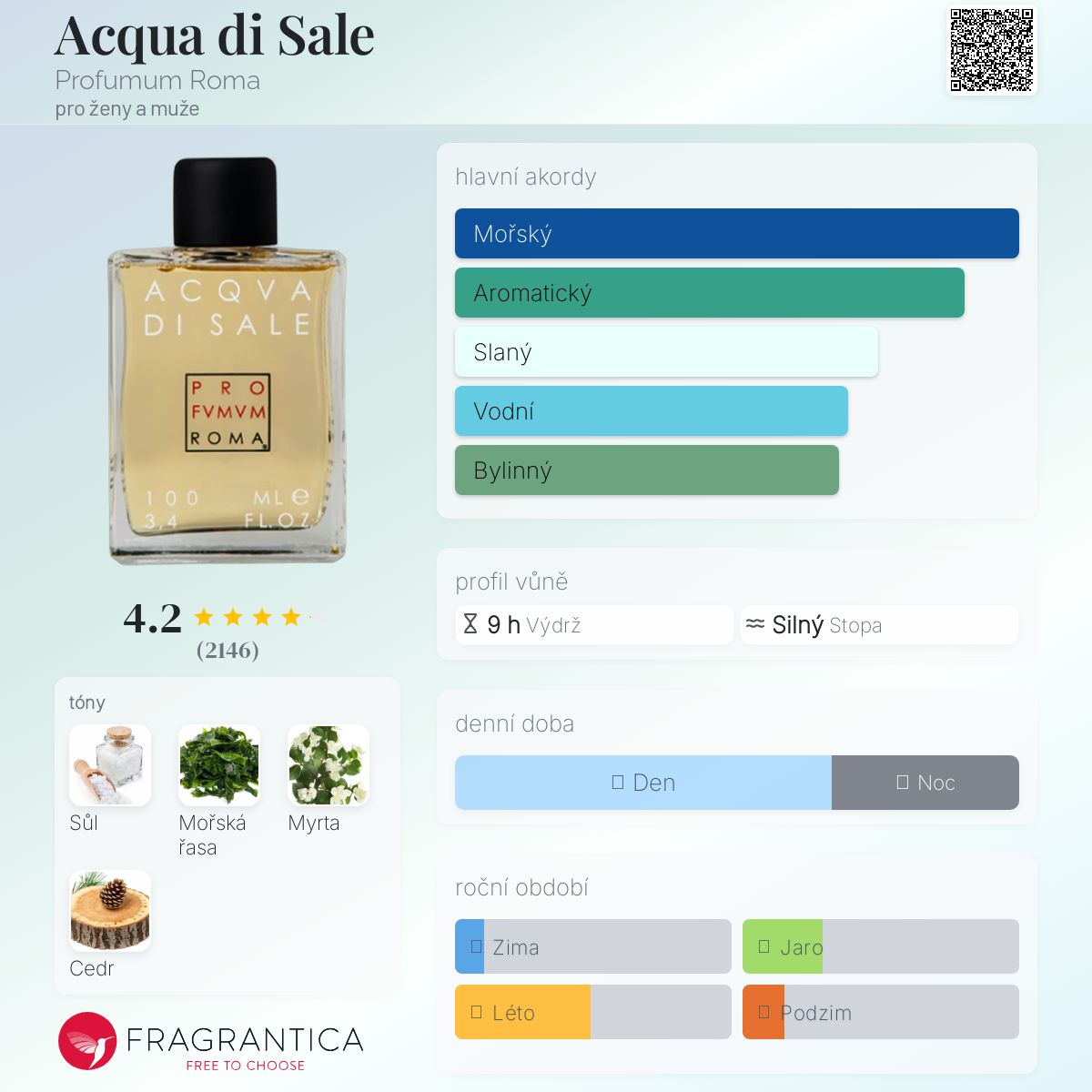 Acqua Di Sale má vonět jako divoké moře a člověk by si řekl, že je to vůně vhodná na léto. Jde o to, že vůně moře je velmi osobní a specifická vůně, jejíž vnímání závisí na mnoha různých faktorech (je to pláž v Řecku? Atlantský oceán? Pláž v Brightonu? Jaký druh vegetace se nachází u břehu?) Vůně nebude vonět přesně jako moře, ale bude mít charakter, který může vyvolat tuto náladu nebo pocit. Pro mě Acqua Di Sale voní jako luxusní aura, krémová a tajemná slanými minerály s bylinně sladkými podtóny. Neevokuje výhradně letní prostředí, protože má poměrně melancholický charakter, a také vynikající siláž a dlouhá výdrž může vyniknout i v zimě.