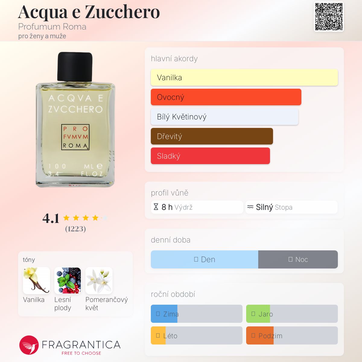 Acqua e Zucchero podle Profumum Roma je Floral Fruity vůně pro ženy a muže. Acqua e Zucchero byl/a uveden/a v roce 2002.