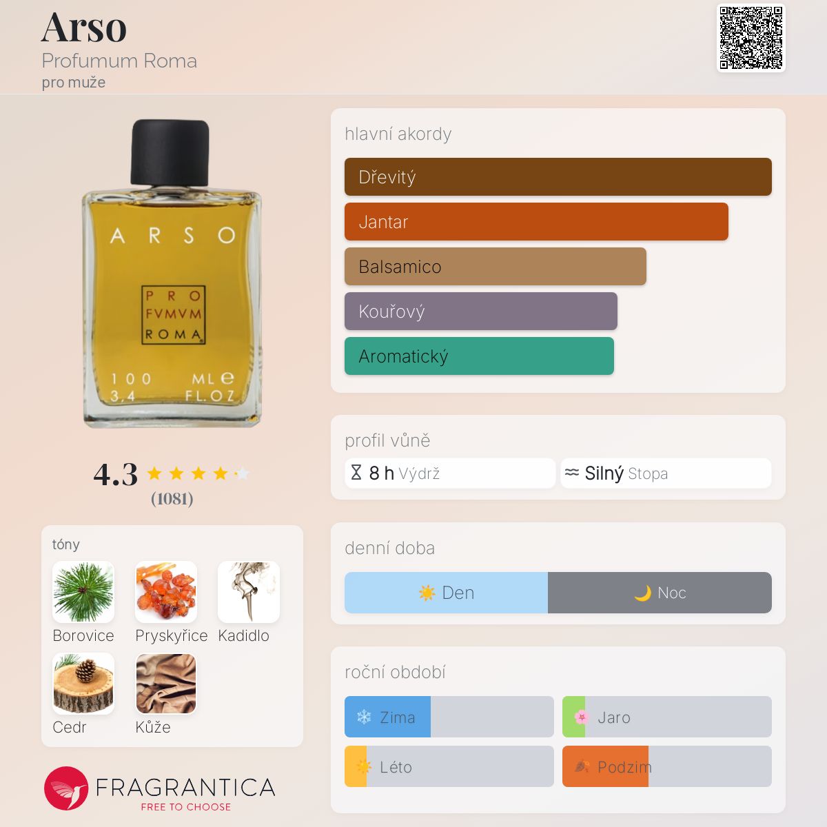 Arso podle Profumum Roma je Leather vůně pro muže. Arso byl/a uveden/a v roce 2010.