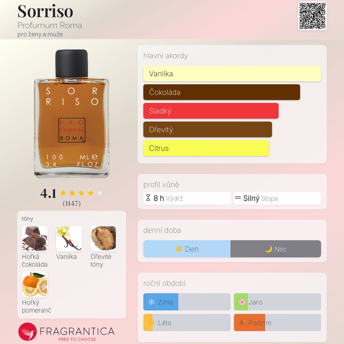 Všechny ostatní tóny (včetně hořké čokolády) jsou tu proto, aby vanilku doplnily, ale zůstávají tiše v pozadí, což se jim daří. Profumum Roma používá přírodní ingredience a na Sorriso je to opravdu znát. Je nádherná.